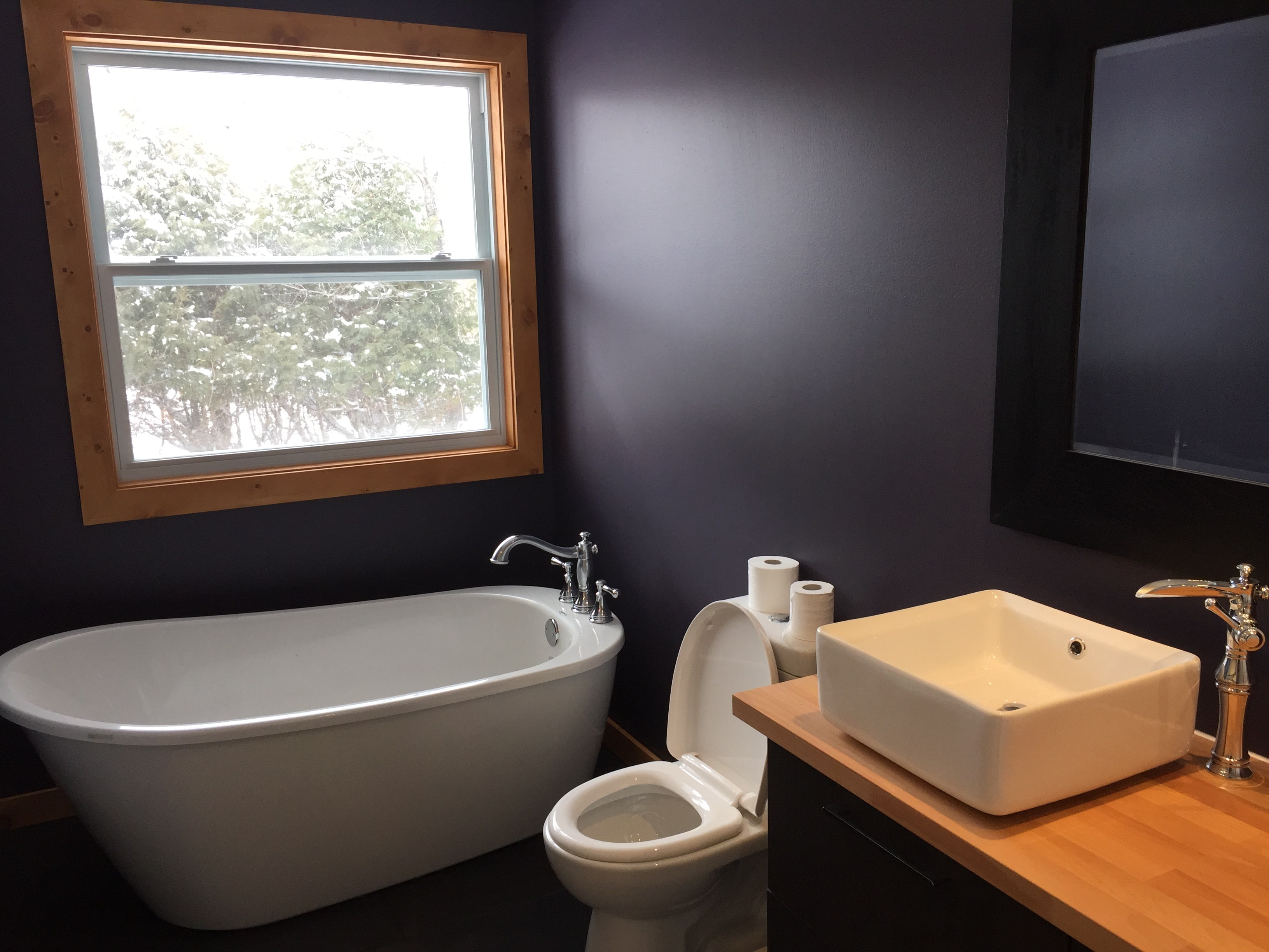 Cette salle de bain a été actualisée et optimisée, tout en créant un espace distinct pour la douche et le bain.